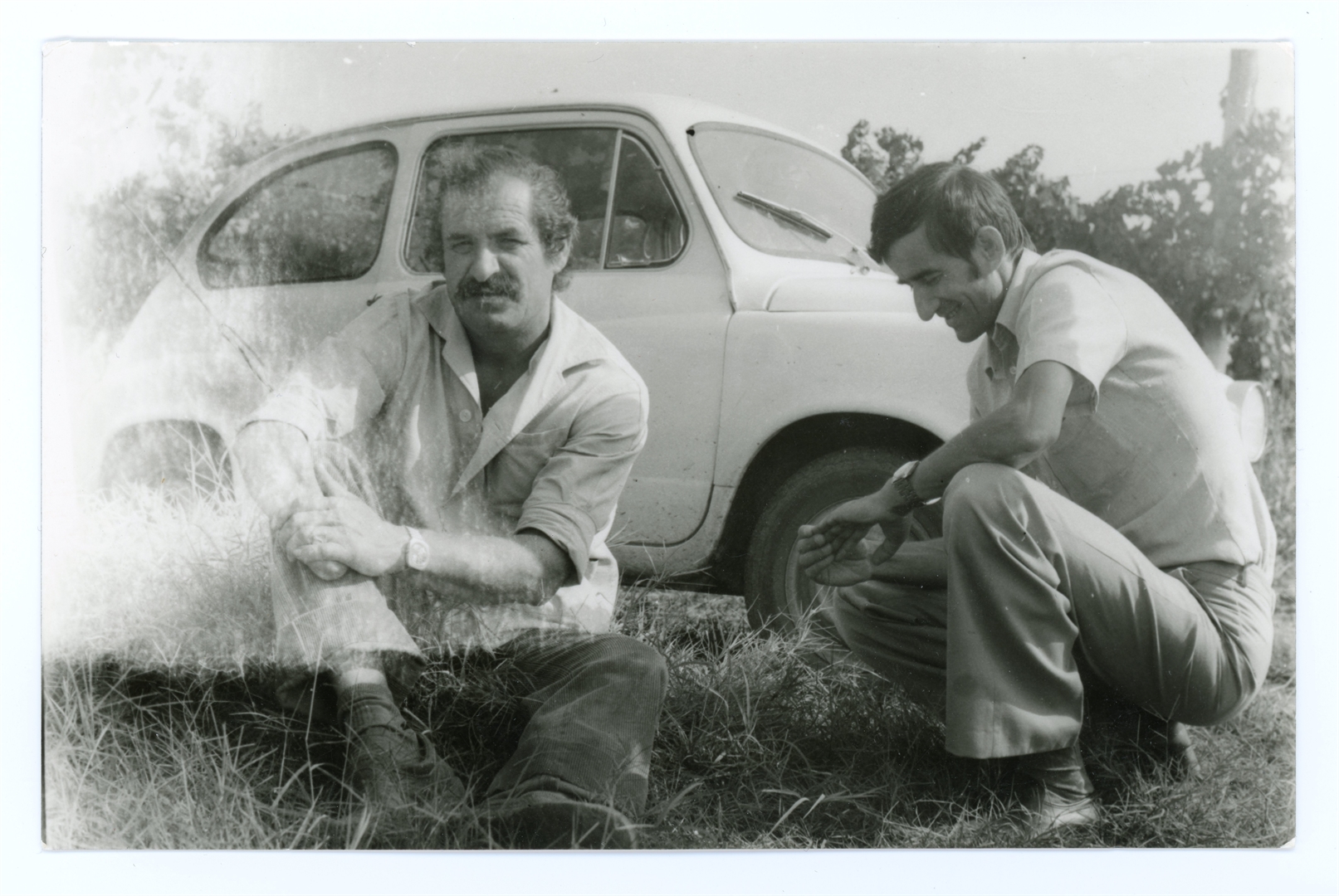 Dva gospodina sjede ispred automobila